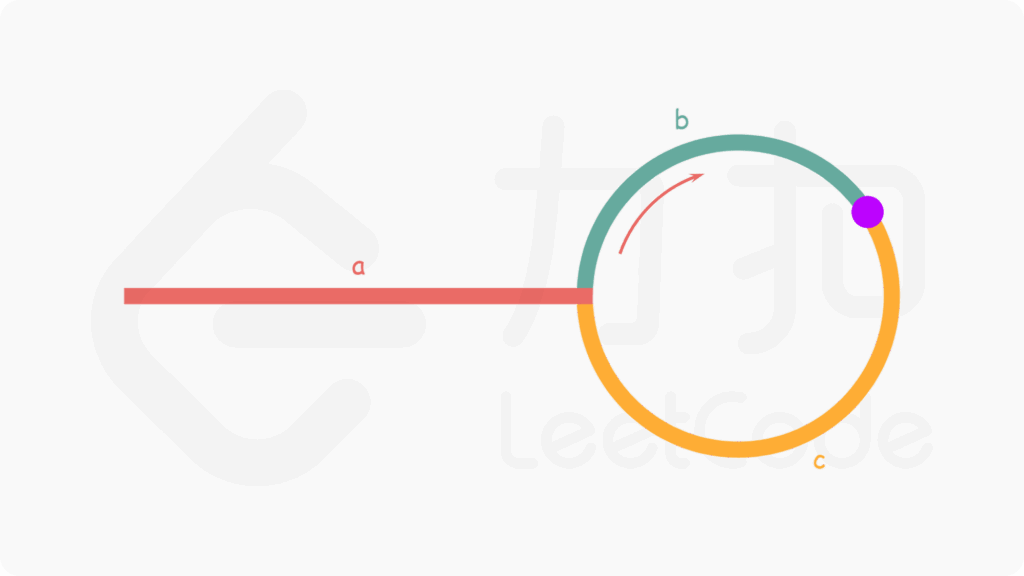 如下图,慢指针走了 a + b 的距离,快指针此时走了 a + b + n(b + c) 距离,并且快指针的速度是2倍的慢指针,所以能够得出 a = c+(n−1)(b+c) , 即让slow和head同时移动,相遇点就是入口。